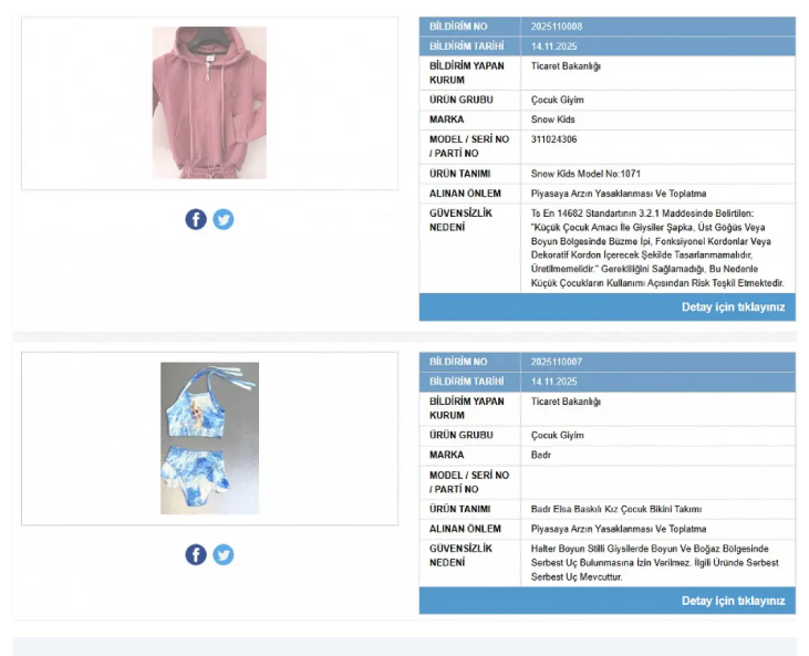 Ticaret Bakanlığı tarafından yapılan son denetimler sonucunda ‘Güvensiz Ürün Bilgi Sistemi’ üzerinden insan sağlığını riske atacak yeni yeni ürünler paylaşıldı. Listede Türkiye’de çocuk giyimi üzerine satış yapan 2 marka da yer aldı.