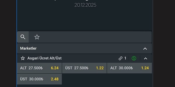 Evrensel’de yer alan habere göre, bir illegal bahis sitesi 2026 yılı asgari ücreti için alt/üst şeklinde bahis açtı. Bahise göre en olası ihtimal asgari ücretin 30 bin TL altında olması iken ücretin 30 bin TL bandını aşması ihtimaline verilen oranlar altında kalması için verilen oranın iki katı seviyesinde belirlendi.